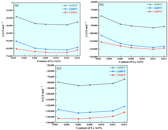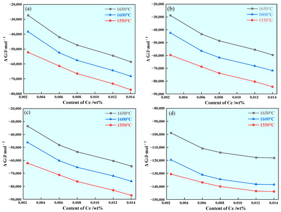 The Gibbs free energy of each reaction, as generated by rare earth inclusions in U75V steel under different rare earth contents and presented in Table 4 and Table 5, is calculated according to the combination of Equations (1)–(4):