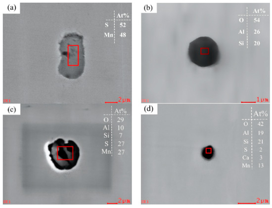 Inclusion species and morphology in Sample S1: (a) MnS, (b) Si-Al-O, (c) Al-Si-O + MnS and (d) Al-Si-Ca-Mn-S-O.