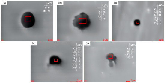 Inclusion in U75V after the addition of rare earth: (a) MnS, (b) Al-Ca-S-O-CeAlO3, (c) Al-Si-Ca-S-O-CeAlO3, (d) Mg-Al-Ca-Mn-O-S-CeAlO3, and (e) S-Ti-V-Ce.