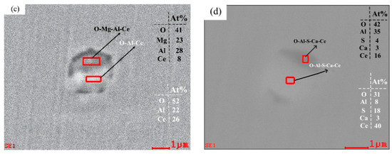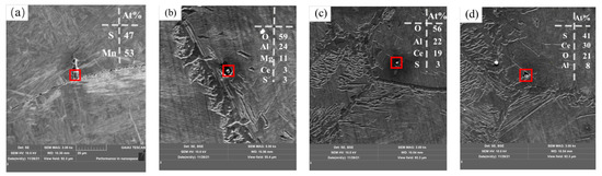 In addition, double-layer complex inclusions containing Ce were found in Sample S3 with rare earth additives, as shown in Figure 8a. Double-layer complex inclusions containing Ce inclusions were found in Sample S4, as shown in Figure 8b. These two types of double-layer inclusions have a regular morphology and smaller size than those without the rare earth additive. With the increase in Ce content, complex inclusions containing CeAlO3 wrapped by MgO-CeAlO3 were found in Sample S5, as shown in Figure 8c. It is noteworthy that Al-Ca-Ce-O-S double-layered composite inclusions were found in Sample S5, as shown in Figure 8d. According to the calculation results of Figure 5c and equation (6), it is not difficult to find that with the increase in Ce content, some CeAlO3 inclusions will react with S, O and other elements to form Ce2O2S inclusions [25], and according to the energy spectrum atom percentage in Figure 8d, it can be deduced that the core part of the inclusion is a complex inclusion containing Ce2O2S. The low Ce content may be the reason for the absence of Ce2O2S inclusions in Samples S2–S4.