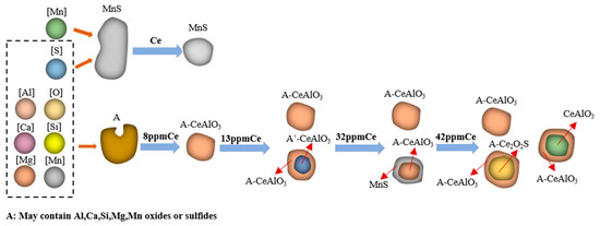 - Adabavazeh, Z.; Hwang, W.S.; Su, Y.H. Effect of Adding Cerium on Microstructure and Morphology of Ce-Based Inclusions Formed in Low-Carbon Steel. Sci. Rep. 2017, 7, 46503. [Google Scholar] [CrossRef]
