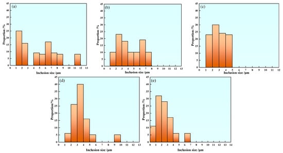 Figure 11 shows the average size distribution of inclusions in samples with different rare earth Ce contents. In Sample S1 without rare earth treatment, the inclusion size distribution ranges from 1 to 12 μm, and the size distribution range is large. The inclusion size range of 1–2 μm accounts for about 25%, and the inclusion size range of less than 5 μm accounts for 51%, as shown in Figure 11a. The average size and proportion of inclusions in Sample S2 are shown in Figure 11b. The size of inclusions in Sample S2 containing 0.0008% rare earth Ce is distributed within 1–8 μm, and the proportion of inclusions in the range 2–3 μm is about 23%, and inclusions above 10 μm disappear. The size distribution of inclusions in Sample S3 is shown in Figure 11c. It can be seen that the size of inclusions in Sample S3 is basically less than 5 μm, among which the inclusions with a size of 2–3 μm occupy the highest proportion. The inclusions in Samples S4 and S5 were mainly distributed in the range of 1–6 μm, and the proportion of inclusions smaller than 5 μm was 92%, which was significantly higher than that of Sample S1, as shown in Figure 11d,e. With the increase of rare earth content, the effect of rare-earth-refining inclusions becomes more obvious. The modification of non-metallic inclusions such as MnS in steel by rare earth elements is the main reason for the size refinement of inclusions, but there are still a small amount of large-size inclusions in the samples containing rare earth. The reason may be that the lower rare earth content fails to completely modify the inclusions such as MnS and Al2O3 in steel, so there is still the possibility of large-size inclusions in steel.
