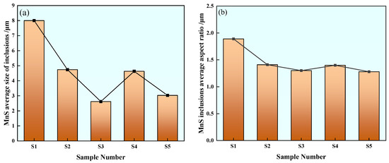 Among all kinds of inclusions in U75V heavy rail steel, MnS inclusions have the greatest impact on the continuity, strength, toughness and mechanical properties of the steel matrix during steel processing, so the average size and aspect ratio changes of MnS inclusions are analyzed separately. The statistics of average size changes of MnS inclusions in different samples are shown in Figure 12a. The average size of MnS inclusions in Sample S1 is 8 μm. The average size of inclusions in Sample S2 is 4.74 μm, which is about 41% lower than that in Sample S1. The average inclusion size of Sample S3 is 2.62 μm, which is about 67% lower than that of Sample S1. The average inclusion size of Sample S4 is 4.63 μm, which is about 42% lower than that of Sample S1. The average inclusion size of Sample S5 is reduced by about 62%. Compared with the MnS inclusion size of U75V steel without rare earth treatment, it is found that the MnS inclusion size in steel is greatly reduced by different rare earth contents.