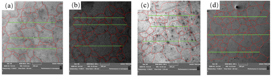 Scanning electron microscopy was used to observe the macro structures in different samples after heating to 1200 °C for 1 h and water cooling, as shown in Figure 13. It can be seen from Figure 13a–d that the grain size of the steel after adding rare earth decreases.