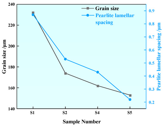 The pearlite structure was observed by emission scanning electron microscopy, as shown in Figure 14. From Figure 14a–d, it can be seen that the layer is clearly refined after the addition of rare earth. In order to further represent the changes of grain size and pearlite lamellae spacing, Image-J 1.53a software was used to measure the grain size and pearlite lamellar layer. Eight fields of view were selected for each statistical sample, and the average value was obtained after measurement by the trans-sectional method. The measurement results are shown in Figure 15. The grain size of Sample S1 without rare earth Ce is 232 µm. With the increase in rare earth content in experimental steel, the grain sizes of Samples S2, S4 and S5 decrease to 174 µm, 162 µm and 153 µm, respectively. The grain size of Sample S5 containing 0.0042% rare earth Ce is the smallest. Compared with Sample S1 without rare earth Ce, it is reduced by about 35%. Due to the active chemical properties of Ce, the inclusion containing Ce formed after rare earth was added to the steel can act as a heterogeneous nucleating agent, which can inhibit the grain growth and optimize the structure of the steel. After the addition of rare earth Ce in the steel, the grains are continuously refined, which means that there are more grain boundaries, which can absorb more impact or tensile energy, slow down the expansion of steel cracks and improve the mechanical properties of steel [33]. The pearlite lamellae spacing of Sample S1 without rare earth Ce was 0.87 µm, and the pearlite lamellae spacings of S2, S4 and S5 samples after rare earth Ce was added were reduced to 0.53 µm, 0.43 µm and 0.22 µm, respectively, among which the pearlite lamellae spacing of Sample S5 containing 0.0042% rare earth Ce was the smallest. Compared with the Sample S1 without Ce, it was reduced by about 75%. It can be seen that Ce has an obvious thinning effect on grain size and pearlite lamellae spacing.