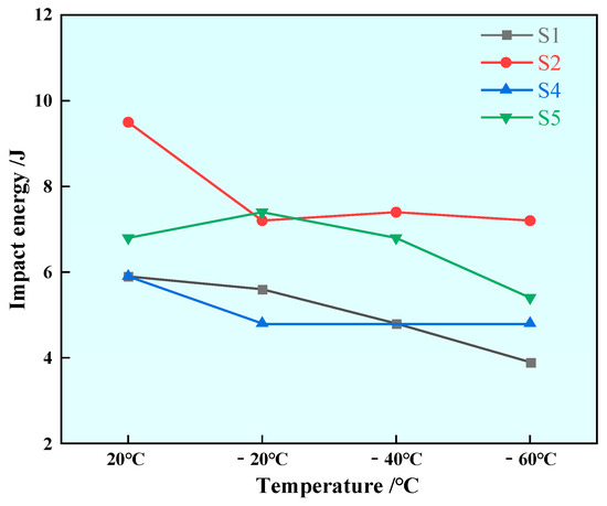 Impact experiments were conducted on samples with different rare earth contents, and the results are shown in Figure 17. The impact energy of Sample S1 without rare earth elements was 5.9 J at 20 °C; the impact energies of Samples S2, S4 and S5 with rare earth element additives were 9.5 J, 5.9 J and 6.8 J at 20 °C, respectively; and the impact energy of Samples S2 and S5 at room temperature was improved. The impact energy of Sample S1 is 5.6 J at −20 °C, and the impact energies of Samples S2, S4 and S5 with rare earth additive were 7.2 J, 4.8 J and 6.8 J at −20 °C, respectively. The impact energy of Sample S1 was 4.8 J at −40 °C, and the impact energy of Sample S2 and S5 increased to 7.4 J at −40 °C after the addition of rare earth. The impact energy of Sample S1 was 3.9 J at −60 °C, and the impact energy of Samples S2, S4 and S5 increased to 7.2 J, 4.8 J and 5.4 J at −60 °C after the addition of rare earth Ce. As can be seen from Figure 17, the addition of rare earth can improve the impact performance of U75V steel, especially in different degrees under low-temperature conditions, which has good reference significance for railway construction in extremely cold areas.