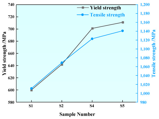 Figure 20 shows the yield strength and tensile strength of the U75V steel sample before and after adding rare earth. The yield strength of Sample S1 was 600 MPa, and the yield strength of Sample S2 after adding 0.0008% rare earth Ce was 642 MPa, which is about 7% higher than that of Sample S1. The yield strength of Sample S4 after adding 0.0032% Ce was 701 MPa, which is about 16.8% higher than that of Sample S1. The yield strength of Sample S5 steel after adding 0.0042% rare earth Ce was 711 MPa, which is about 18.5% higher than that of Sample S1.