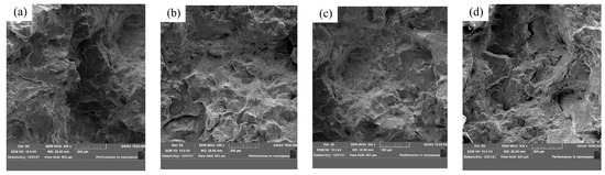 Tensile fracture morphology: (a) without rare earths and (b–d) with rare earths.
