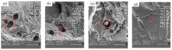 Scanning electron microscopy was used to observe the morphology of the tensile specimen fracture and analyze the inclusion, and the tensile fractures are shown in Figure 21. The tensile fracture morphology of Sample S1 without rare earth Ce is step and river, which is a typical brittle fracture, as shown in Figure 21a. After the addition of different rare earth contents, obvious dimples were generated in the tensile fracture of the sample, and the tear edges became smaller, as shown in Figure 21b–d. This shows that the change from brittle fracture to ductile fracture is beneficial to the improvement of tensile properties, which is consistent with the experimental results.
