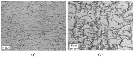 Typical microstructure of (a) HSLA and (b) DP steel (reproduced with permission from Reference [31]; copyright © 2024 Woodhead Publishing Limited. All rights reserved).