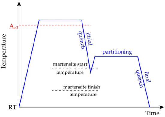 Thermal cycle for the quenching and partitioning process (Ac3—transformation temperature, RT—room temperature), prepared with permission from Reference [132] (copyright © 2024 Acta Materialia Inc. Published by Elsevier Ltd. All rights reserved).