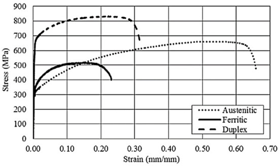Comparison of tensile curves of selected corrosion-resistant steel families (reproduced with permission from Reference [139] (copyright © 2024 Elsevier Ltd. All rights reserved).