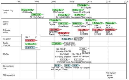 - Furuta, T. Automobile applications of titanium. In Titanium for Consumer Applications Real World Use of Titanium; Froes, F., Qian, M., Niinomi, M., Eds.; Elsevier: Amsterdam, The Netherlands, 2019; pp. 77–90. [Google Scholar]