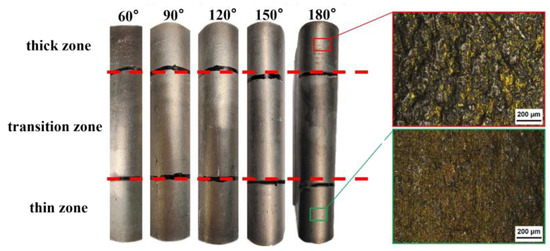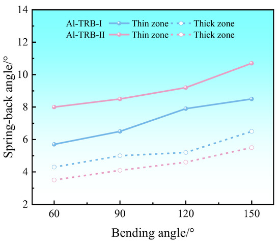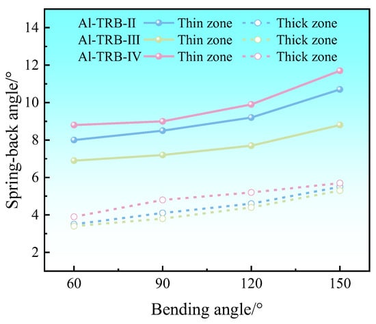 The spring-back angles of Al-TRB after three-point bending are shown in Table 2. It can be seen that the spring-back angle in the thin zone of Al-TRB is larger than that in the thick zone, and the spring-back phenomenon is more obvious. The maximum difference in the spring-back angle between the thin and thick zones is 2.5° when the bending angle is 180°. With the increase in the bending angle, the spring-back angles of the thin and thick zones of the Al-TRB bending parts are gradually increased. The size of the spring-back angle in the thin and thick zones is greatly related to the differences in their mechanical properties and the work hardening rate of the deformation process.