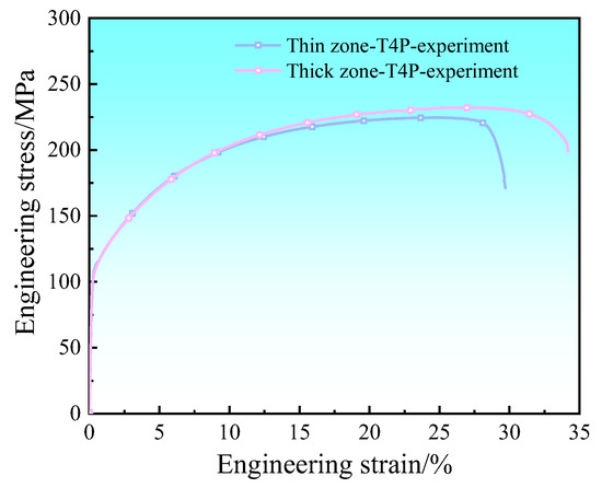 Engineering stress–strain curves in the thin and thick zones of the T4P state Al-TRB.