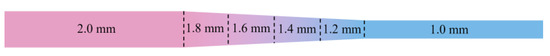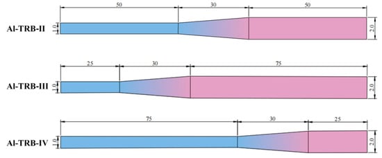 VGR experiment was carried out on a four-high cold rolling mill (RAL, Shenyang, China) to roll the raw material into Al-TRB with the thicknesses of 1.0 mm and 2.0 mm in the thin and thick zones, respectively. The ratio of variable gauge of TRB was 1:2, and the slope of the transition zone was 1:30. The schematic diagram of VGR and the dimensions of the obtained Al-TRB are shown in Figure 1.