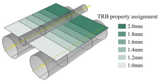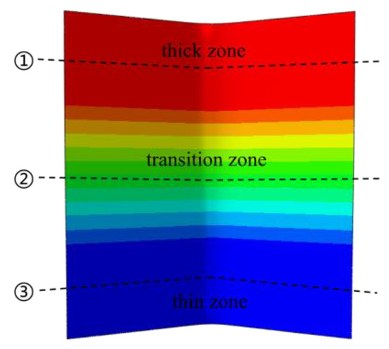 The engineering stress–strain curves in the thin and thick zones of the T4P state Al-TRB measured using a tensile experiment are shown in Figure 7. In the thin zone of the Al-TRB, the measured yield strength is 100 MPa, the tensile strength is 224 MPa, and the elongation at break is 29.7%. In the thick zone of the Al-TRB, the measured yield strength is 99 MPa, the tensile strength is 232 MPa, and the elongation at break is 35.1%. The mechanical properties in the transition zone of the Al-TRB in the T4P state undergo a linear transition from the thin zone to the thick zone. Therefore, under the premise of ensuring the simulation accuracy, the transition zone is discretized into equal-thicknesses parts with four thicknesses of 1.2 mm, 1.4 mm, 1.6 mm, and 1.8 mm, as shown in Figure 8, and their mechanical properties are obtained from tensile tests. The mechanical properties at any thickness of the Al-TRB transition zone were obtained by linear interpolation so as to establish the material property model of the Al-TRB transition zone.
