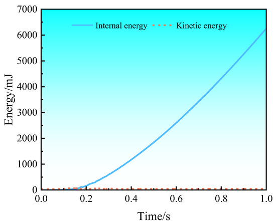 The three-point bending process was completed in one analysis step using the dynamic display algorithm. In order to speed up the calculation, a mass amplification factor was used, which has the effect of amplifying the calculation time of a single step close to the set target time of 1 × 10−5 s. The changes in kinetic energy and internal energy calculated using the ABAQUS software during three-point bending are shown in Figure 10. It can be seen that the ratio of kinetic energy to internal energy is much less than 5%, indicating that mass amplification has no significant effect on the calculated results of three-point bending, and the calculated results are real and reliable.