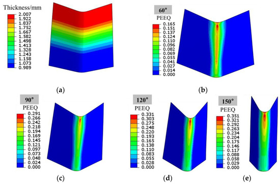 Equivalent strain distribution of Al-TRB after bending: (a) Al-TRB thickness distribution; (b) bending angle of 60°; (c) bending angle of 90°; (d) bending angle of 120°; (e) bending angle of 150°.