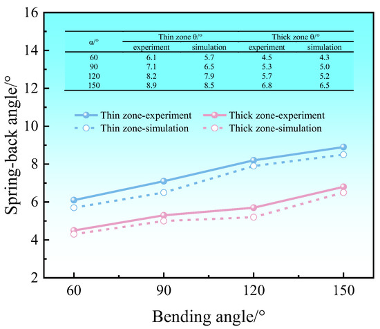 Simulation results of spring-back angles of thin and thick zones at different bending angles.