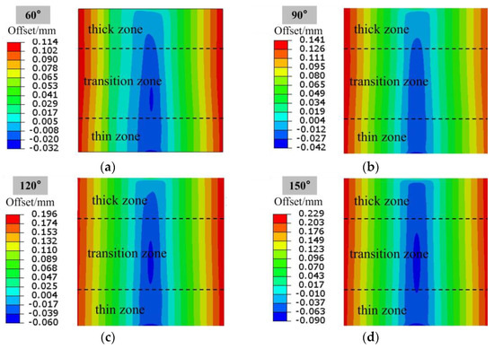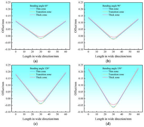 Variation in offset along the width direction in each thickness zone of Al-TRB for different bending angles: (a) bending angle of 60°; (b) bending angle of 90°; (c) bending angle of 120°; and (d) bending angle of 150°.