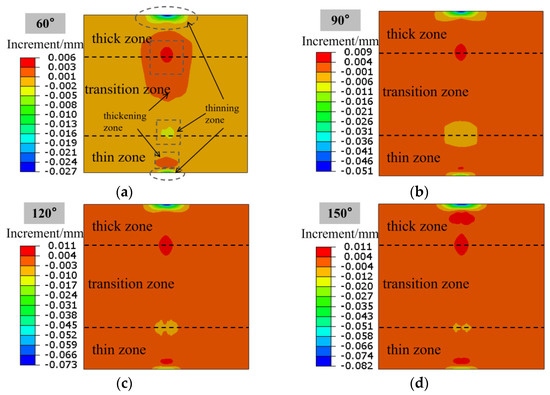 Thickness variation in Al-TRB after three-point bending: (a) bending angle of 60°; (b) bending angle of 90°; (c) bending angle of 120°; and (d) bending angle of 150°.
