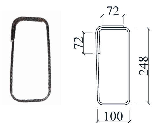 In this study, ordinary concrete with a compressive strength grade of C30 was used, and the standard value of the cubic compressive strength of concrete fcu was tested to be 33.00 MPa, which was converted into a cylinder compressive strength fc′ of 26.07 MPa (fc′ = 0.78fcu). HRB400 steel bars of diameter of 20 mm were used as longitudinal reinforcements, and GFRP stirrups of diameter of 6 mm were used as shear reinforcements to reinforce the concrete beams. A photograph and schematic diagram of the GFRP stirrups are shown in Figure 2 [27]. According to ASTM D7205/D7205M-06 [28], the tensile properties of GFRP bars were determined using straight GFRP bars with a diameter of 6 mm, and were made of the same material as the GFRP stirrups. The tested tensile strength and elastic modulus of GFRP bars were 716.3 MPa and 55.6 GPa, respectively. The detailed tensile test results of GFRP bars are shown in Table 2.