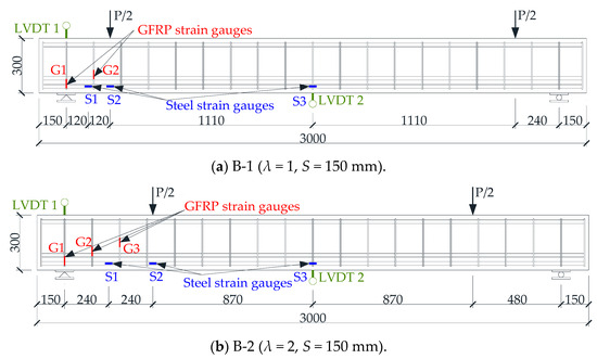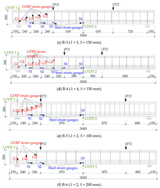 A total of 6 concrete beams reinforced with GFRP stirrups were tested. The dimensions of all beam specimens were designed to be 150 mm in width, 300 mm in depth, 3000 mm in length and 2700 mm in span [27], as shown in Figure 1. Steel bars with diameter of 20 mm were adopted as the longitudinal reinforcement, and GFRP bars with diameter of 6 mm were adopted as the stirrups. Each beam specimen contained six longitudinal steel bars, two of which were placed on the top, and the other four were arranged in two rows at the bottom of the beam. The concrete cover of each beam was uniformly 20 mm. In this study, four shear span to depth ratios (λ = 1, 2, 3 and 4) and three stirrup spacings (S = 100, 150 and 200 mm) were designed as the parameters influencing the shear capacity of beams. Each beam specimen was identified by a code starting with “B”. More specific parameters and details of the beams are listed in Table 1.