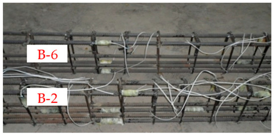Reinforcing cage consisting of steel bars and GFRP stirrups with strain gauges pasted. Note: The top specimen is B-6 (λ = 2, S = 200 mm); the bottom one is B-2 (λ = 2, S = 150 mm).