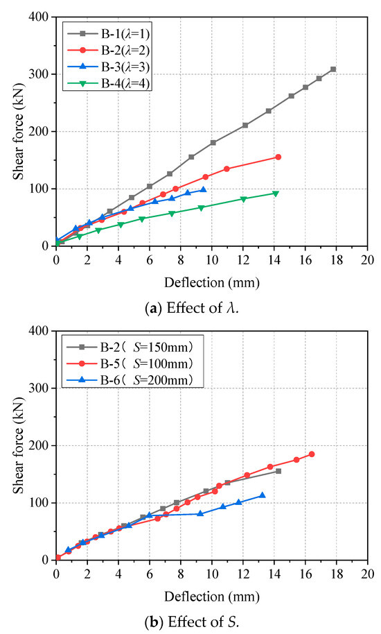 The effects of shear span to depth ratio (λ) and stirrup spacing (S) on the shear force-deflection responses at midspan of the beam specimens are shown in Figure 6. As is found, before the first crack, the shear-deflection behavior of all beams was nearly linear. After cracking, the effective concrete area decreased, and the moment of inertia decreased, so that the shear force–deflection curve of the beams was still linear, but the stiffness was reduced [30]. Figure 6a revealed that the bending moment increases rapidly with the increase in λ, and the deformation of the beam also increases [31]. It is worth noting that in Figure 6b the deflection of specimen B-6 suddenly increased at 78 kN. This is due to an insufficient stirrup ratio causing some stirrups to reach the limit deformation earlier and brittle fracture. That is to say, the inhibition of GFRP developing into inclined cracks in concrete improves the bearing capacity and ductility of beam specimens. On the other hand, for B-2 and B-5, the slope remains linear, revealing that the contribution of GFRP stirrups to the beam shear capacity remains at a high level. In Summary, GFRP, as a kind of stirrup, exerts its high strength and high ductility to improve the strength and deformation capacity of concrete beams.