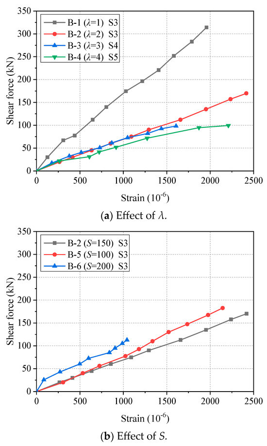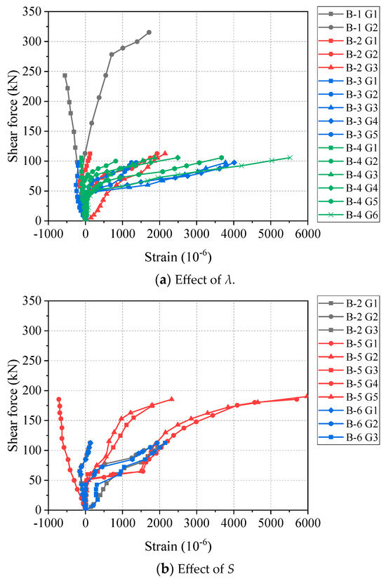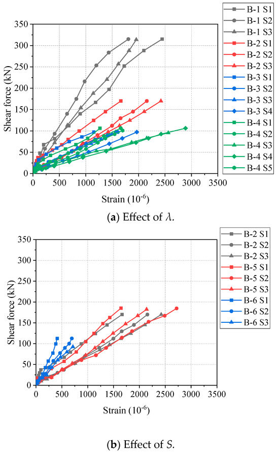 The relationships between the shear force and the strain of longitudinal bars of all beam specimens are shown in Figure 7. It can be found that all beams have a similar shear force–strain linear relationship. As shown in Figure 7a, with the increase in λ, the slope of the curve decreases. Since the larger λ leads to the larger bending moment in the purely bending part of the beam, the strain of the longitudinal reinforcement will be greater under the same shear force. As shown in Figure 7b, the influence of S on the strain of steel longitudinal reinforcement is not significant, which is similar to the results of previous tests [31]. In addition, the shear force–strain curves at different positions of longitudinal bars are shown in Figure 8. Generally, the slope of the curve at the position closer to the support is larger. This is because when the position is closer to the support point, the shear force of the beam is larger.