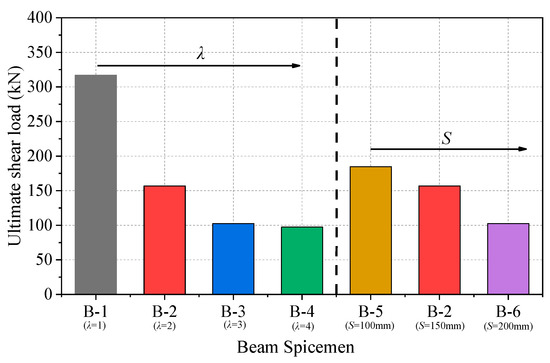 Figure 10 shows the variation in the ultimate shear force of the beam specimens with λ and S. With the increase in S and λ, the ultimate shear force tended to decrease. On the one hand, as λ increased from 1 to 2, 3, and 4, the ultimate shear force of the beam decreased by 50.5%, 67.7%, and 69.2%, respectively. The increase in λ led to a decrease in the critical shear crack angle, so the bearing capacity of the corresponding section decreased, and the shear capacity decreased accordingly. On the other hand, as S increased from 100 to 150 and 200, the ultimate shear force of the beam decreased by 16.1% and 44.6%, respectively. This was because the decrease in S means denser stirrups, which confined concrete and limited the development of the cracks of the beam.