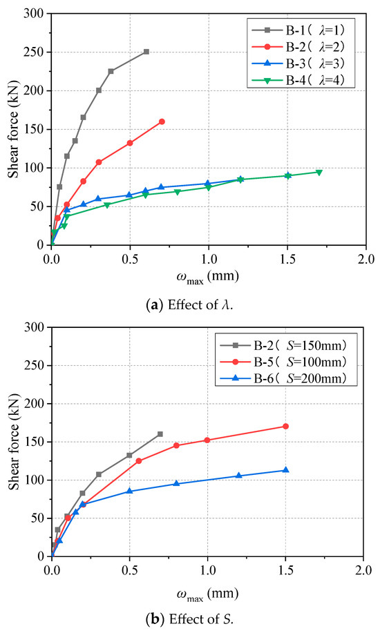 The relationship curves between the maximum diagonal crack width of beam ωmax and the shear force are shown in Figure 12. The ωmax increases with the increase in shear force, and the slope of the curve increases with the increase in shear force. As can be seen from Figure 12a, the slope of the curve increases faster with the increase in λ. As can be seen from Figure 12b, the curve increases linearly at the beginning, and there is an obvious sudden increase before failure, and the slope of the curve will increase faster with the increase in S. Therefore, λ and S are both important factors affecting crack development.