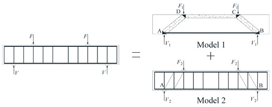 After the beam specimen appeared oblique cracks, the beam mainly bore the shear force through the tension of the stirrups and some longitudinal reinforcements and the compression of the concrete. As shown in Figure 13, the shear capacity model of the beam was composed of Model 1 and Model 2, which were used to describe beams without a web reinforcement beam and with only stirrups, respectively.