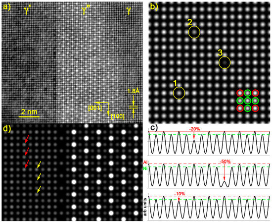 For a more accurate interpretation, an HAADF-HRSTEM image simulation was performed with the multislice method using the JEMS software [34]. In this example, a 24 nm thick [0,1,0] foil with a random partial occupancy of the Al-Nb-Ti sites was considered, keeping on average the γ′ phase composition from Table 3 (Figure 3b,c). A supercell made of 8 × 8 γ′ unit cells contains three “defective columns” (numbered 1, 2, and 3) where 10%, 20%, and 50% of the Nb atoms, respectively, were randomly replaced by Al ones that correspond to an exchange of 2, 5, and 11 atoms out the 64 atoms contained in a column. These “defective columns” show contrasts similar to those observed in Figure 3a, although the replacement of only two Nb atoms in column (1) is barely visible. Figure 3d is a simulation of the γ′/γ″ interface for a 63 nm thick foil (176 atoms in total in a γ′ column). All Nb atoms were replaced by Al atoms in the last γ′ row along the interface and the corresponding contrast became too low to be visible with the dynamic range in this picture. In addition, two “defective columns” were created inside the γ′ body. In each set of three arrows of the same color, those at the top and bottom point to healthy columns for reference. The median arrow points to a defective column where a third of the Nb atoms (21 out of 65) were replaced immediately either below the entrance face of the foil (yellow arrow) or above the exit face (red arrow). The change in contrast is greater when the upper atoms are replaced rather than the lower ones. This difference is attributed to the increasing broadening of the beam with depth in this rather thick foil and possible crosstalk with adjacent columns. It is worth noting on the one hand that this difference in contrast, which is detrimental to phase identification, is useful for determining the depth of nanoprecipitates embedded in foils; for instance, in [40]. But on the other hand, the apparition of crosstalk may introduce a significant bias in EDXS during quantitative analysis and apparent shifts in atomic positions at the level of atomic column resolution [41,42].