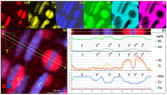 “Pseudo at%” EDXS maps (a–f). Composite Al/Nb map with area (green rectangle) for pure matrix composition measurement and position of the linescan across matrix (γ), γ″ and complex γ′/γ″/γ′ precipitates (g). “Pseudo at%” composition profiles (h).