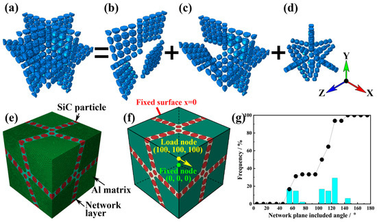 Geometrical model and mesh with network architecture. (a) SiCp arranged similarly to grain boundary structure; (b) SiCp layer perpendicular to the loading direction; (c) SiCp layer parallel to the loading direction; (d) junction layer linking perpendicular and parallel layers; (e) meshes for network composites; (f) boundary condition of the FEM model; (g) statistics on the angle between neighboring network layers in models with network architecture.