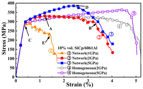 Tensile stress–strain curves of SiCp/6061Al composites with homogeneous and network architectures. The strengths of SiCp are 1, 2, and 5 GPa. A: network composite failure earlier than the homogeneous composite. B and E: main crack initiation. C: failure before yield strength; D: failure at εxx = 2.4%.