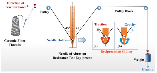 Owing to the limited research on the abrasion resistance performance of ceramic fiber threads at specific bending angles, a set of abrasion resistance performance testing equipment was designed for testing the abrasion resistance performance of the sewing threads. This equipment can be used to evaluate the abrasion resistance performance of ceramic fiber threads at specific bending angles and to simulate the friction they undergo in practical applications. As depicted in Figure 1, the ceramic fiber thread passes through the needle hole of the test equipment, with one end connected to the traction device and the other end turned by a pulley and fixed to a weight of 25 g, forming a bending angle of 90°. During the test, the ceramic fiber thread was subjected to reciprocating friction motion under the traction force and the gravity of the weight, and the traction force was periodically applied and removed (2.5 s/time). After a certain number of friction cycles, the ceramic fiber thread fractures, and its abrasion resistance performance can be characterized by recording the number of friction cycles at the time of fracture. Three sets of samples were tested in parallel for each group, and the average value was recorded. The higher the number of friction cycles, the better the abrasion resistance performance of the ceramic fiber threads.