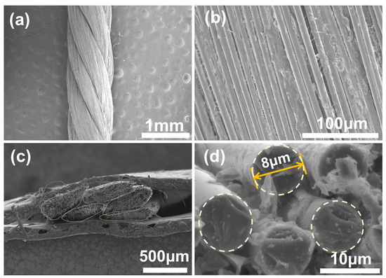 The microstructure in the axial and cross-sectional directions of the original ceramic fiber thread is shown in Figure 2a–d. It is obvious that a single ceramic fiber thread is made by twisting five strands of fiber yarn, and each yarn is composed of numerous parallel-arranged long fibers with a diameter of ~8 μm. The structure of the ceramic fiber thread is relatively loose, which corresponds to easy deformation and movement of a single yarn under external forces and good flexibility at the macro level. In addition, the surface of the fibers is covered with only a small amount of wetting agent and adjacent fibers are independent of each other, providing enough space for the fibers to undergo significant deformation when subjected to force.