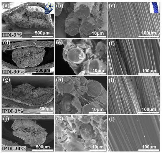 SEM images of ceramic fiber threads modified with HDI-WPU (a–f) and IPDI-WPU (g–l) at concentrations of 3% and 30%.