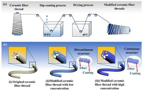 The fabrication process (a) and the formation mechanism of the structure of WPU-modified ceramic fiber threads (b).