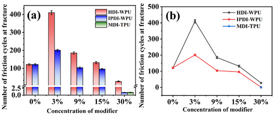 Histogram (a) and line chart (b) of the number of friction cycles at fracture of ceramic fiber threads modified with HDI-WPU, IPDI-WPU, and MDI-TPU at different concentrations.