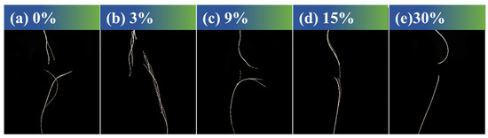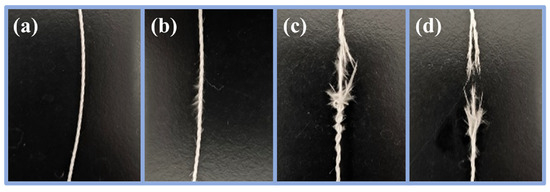 Macroscopic photographs of the ceramic fiber thread during a typical fracture process were recorded as shown in Figure 7a–d. Results suggest that the fracture process of the ceramic fiber threads mainly consists of four stages during abrasion resistance performance testing. The first stage is the bending of the ceramic fiber threads. At this stage, owing to the presence of the bending angle designed in the testing equipment, the ceramic fiber threads initially undergo bending under the combined action of tensile stress and friction. As shown in Figure 8a–c, the surface of the fibers in the original ceramic fiber threads is bare and smooth, and the deformation of the fibers is almost unhindered. Therefore, the fibers easily adapt to large deformations during bending and do not break. After low-concentration WPU modification, a unique discontinuous WPU coating is formed on the surface of the fibers, which contributes to the low resistance force during the bending deformation of the fibers. In the area without a covering coating, enough space can still be provided for the fibers to undergo large deformations, efficiently ensuring the good deformability of the fibers. However, as the concentration of the modifier increases, the coating structure gradually changes from discontinuous to continuous. The surface of the fibers is completely covered by the coating, and the gaps between fibers are also filled with the coating. These continuous coatings not only limit the deformation of the individual fibers, but also bond and fix adjacent fibers to make the ceramic fiber threads a whole. When the ceramic fiber thread is subjected to force bending, this causes more severe stress concentration, making it difficult for it to adapt to large bending angles. Therefore, good abrasion resistance performance under a bending angle requires deformability and elasticity of the ceramic fiber threads. If they cannot adapt to large-angle bends, they are prone to fracture failure at this stage.