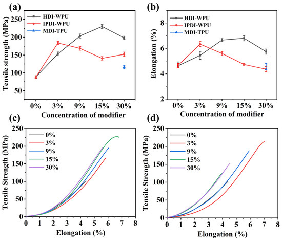 (a) Tensile strength and (b) elongation of ceramic fiber threads before and after modification. The tensile strength–elongation curves of ceramic fiber threads before and after modification with (c) HDI-WPU and (d) IPDI-WPU.