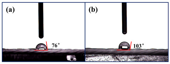 Considering the significant influence of hydrophobicity on abrasion resistance [42,43], testing the hydrophobicity of ceramic fiber threads is crucial. Therefore, the hydrophobicity of the original and the HDI-WPU-modified ceramic fiber threads was also investigated, as shown in Figure 13a,b. The contact angle of the original ceramic fiber thread is approximately 76°, whereas that of the HDI-WPU-modified ceramic fiber thread is approximately 103°, indicating that the coating also enhances the hydrophobicity of the ceramic fiber thread. The increase in hydrophobicity can be related to the roughness of the modified fiber surface.