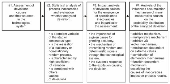 - Factors depending on grinding parameters and conditions—resulting directly from the process parameters and tools used; these factors affect the thermal and mechanical deformations of the machining system and its vibrations; by changing processing parameters, it is possible to control the effects caused by these factors.