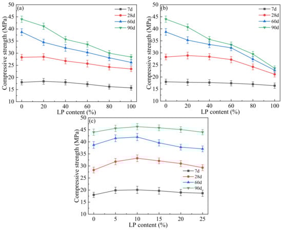 Influence of LP content on compressive strength: (a) LF, (b) LFS, (c) LS.