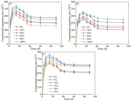 The influence of LP content on the constrained expansion rate of concrete at different ages is shown in Figure 3.