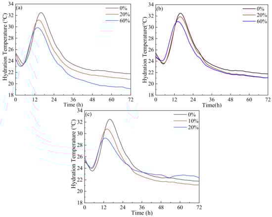 Influence of LP content on hydration temperature; (a) LF, (b) LFS, (c) LS.